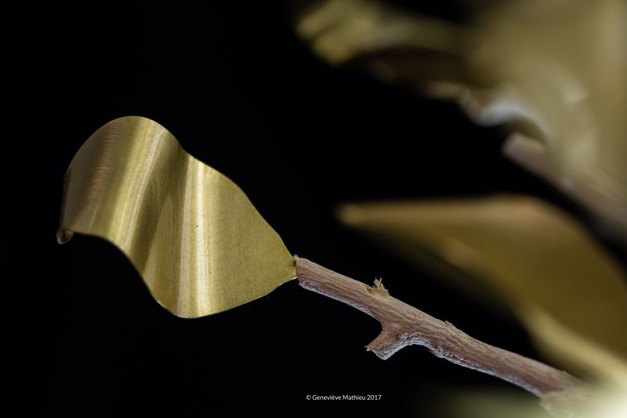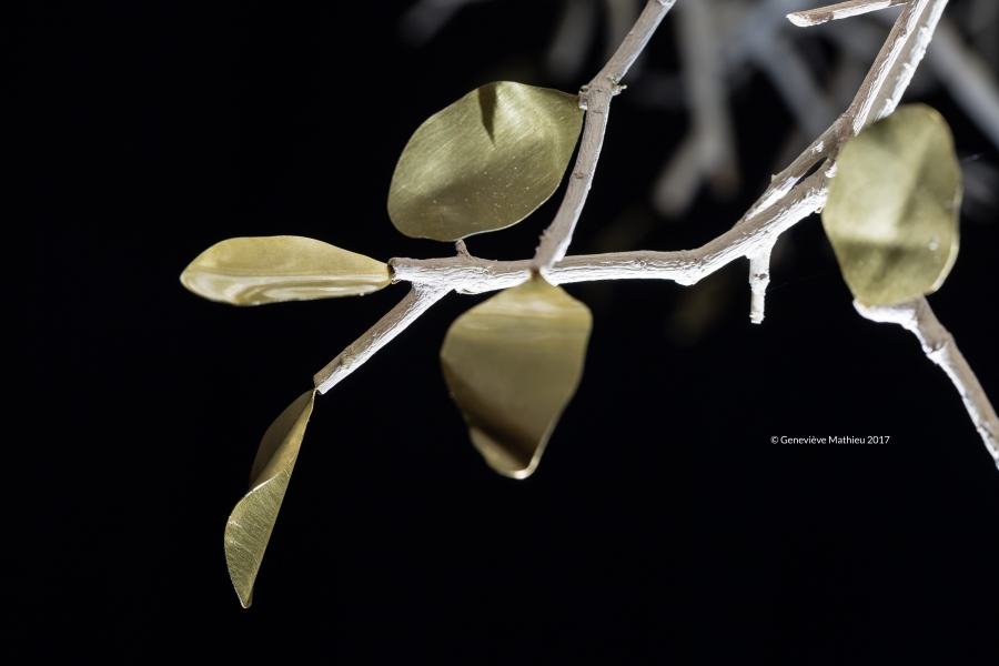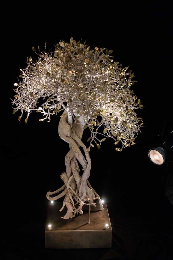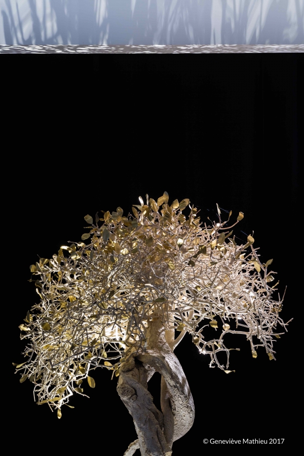 wood and brass sculpture boxwood tree trunk ; brass leaves ; brass stand embedded lightning dimensions (cm) 160 x 90 x 90 photo credit Pascal Fremanteau