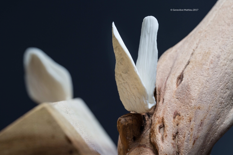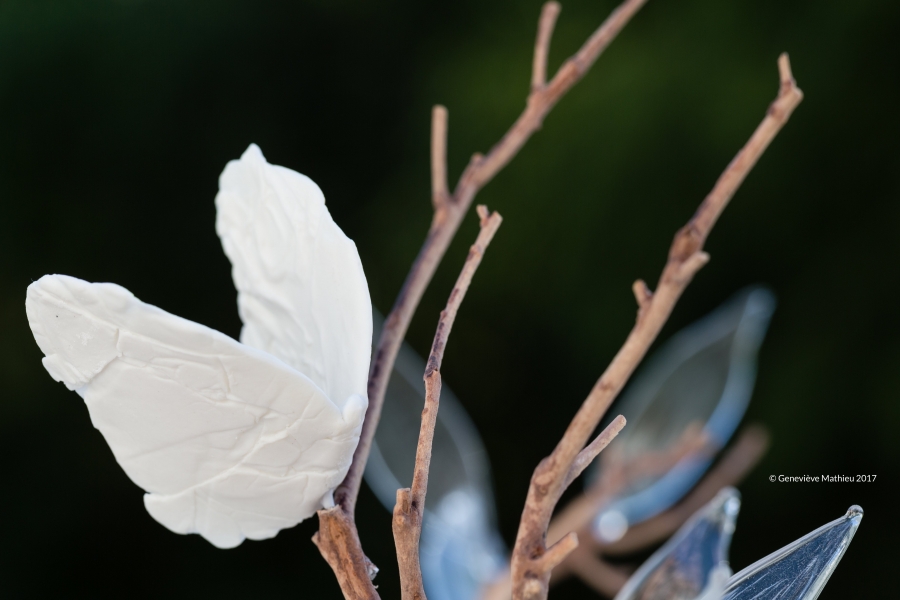 sculpture bois, verre et porcelaine tronc et socle de manzanita ; feuilles de verre ; papillons de porcelaine dimensions (cm) 100 x 65 x 65 papillons en porcelaine par Manoli Gonzalez crédit photos Pascal Fremanteau