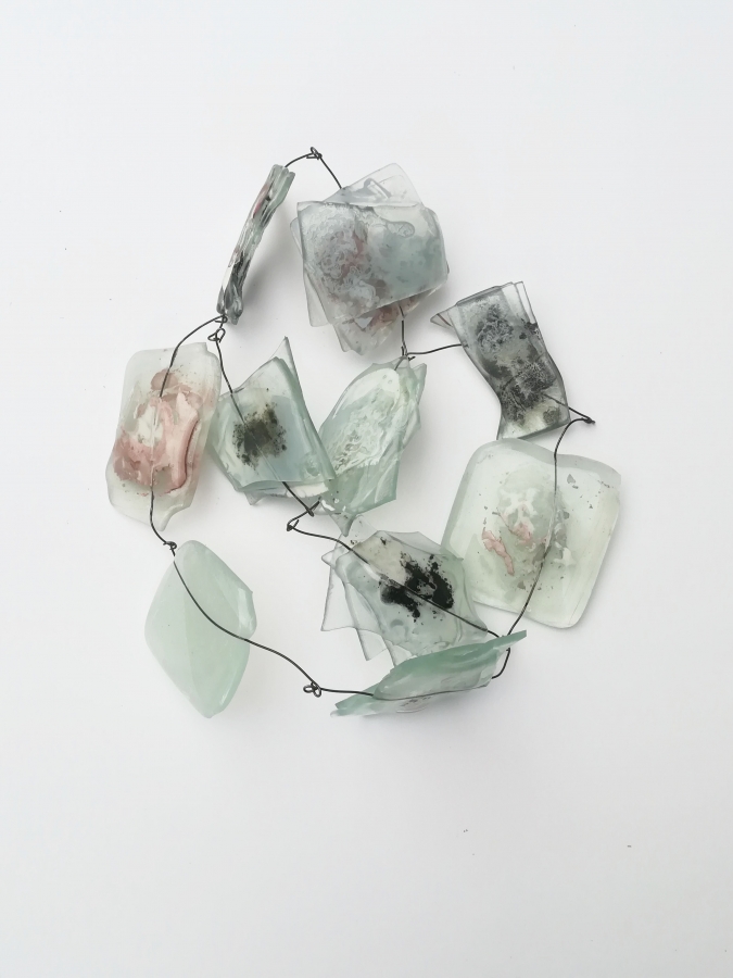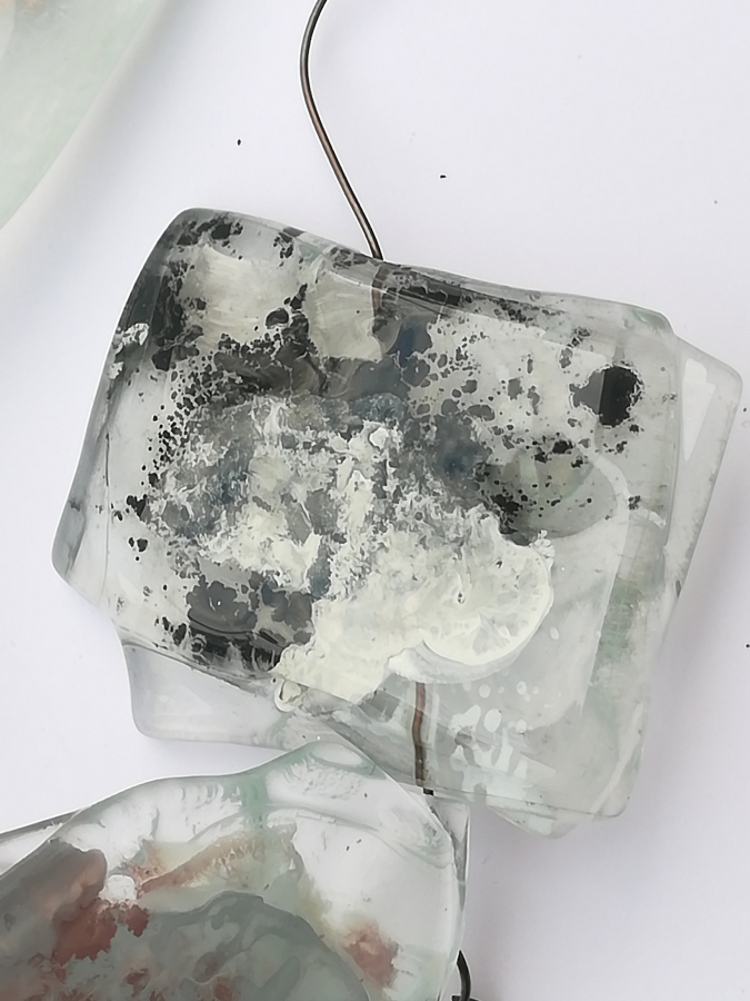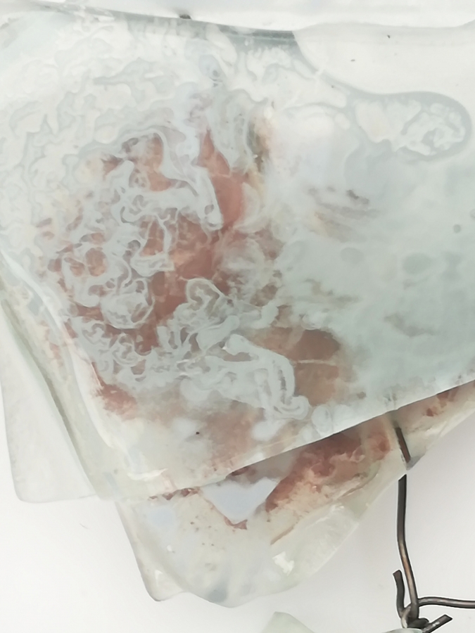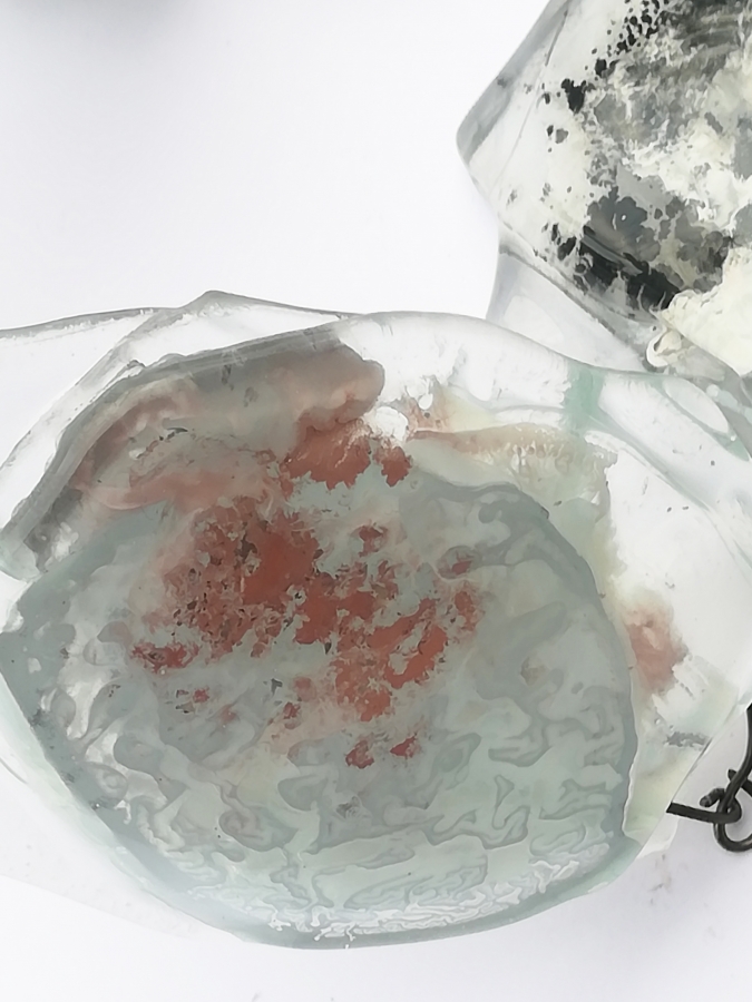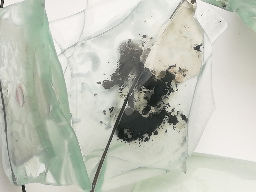 sculpture,thermoformed glass, iron powder, verre thermoformé, poudre de fer, powder made of various stones