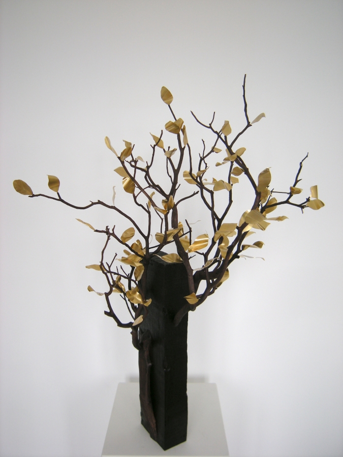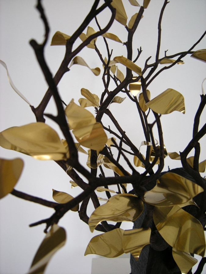 sculpture bois et métal tronc de teck et manzanita ; feuilles de laiton vernis dimensions (cm) 80 x 80 x 70 crédit photos Pascal Fremanteau