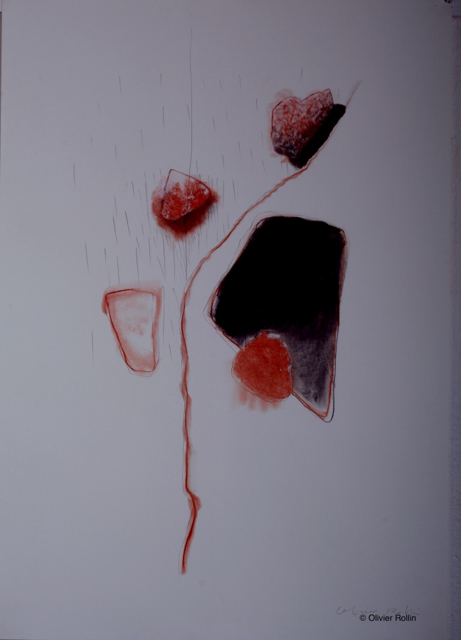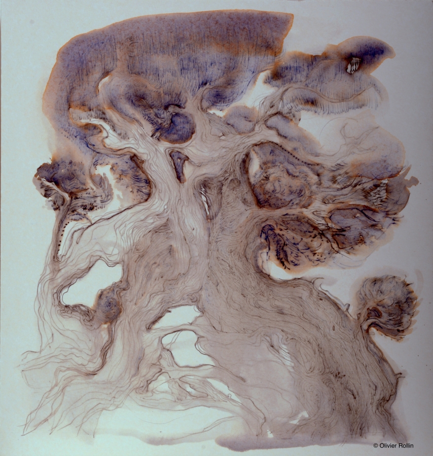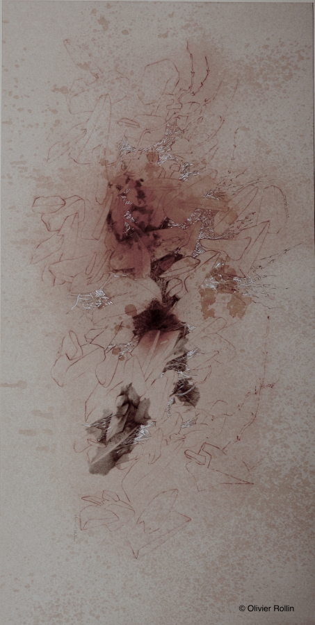 Olivier Rollin considère son atelier d'artiste comme un espace de recherche et d'expérimentation. Il aime croiser les techniques, tester les capacités d'un médium, éprouver un matériau. Ces différentes opérations nourrissent un vocabulaire plastique qui lui est propre. Ainsi jaillit une diversité de production, des approches stylistiques variées, en passant de la peinture au dessin, de la laque au volume. Une nouvelle oeuvre résulte d'un long processus jalonné d'étapes en passant par le dessin, la représentation en trois dimensions et son expression.